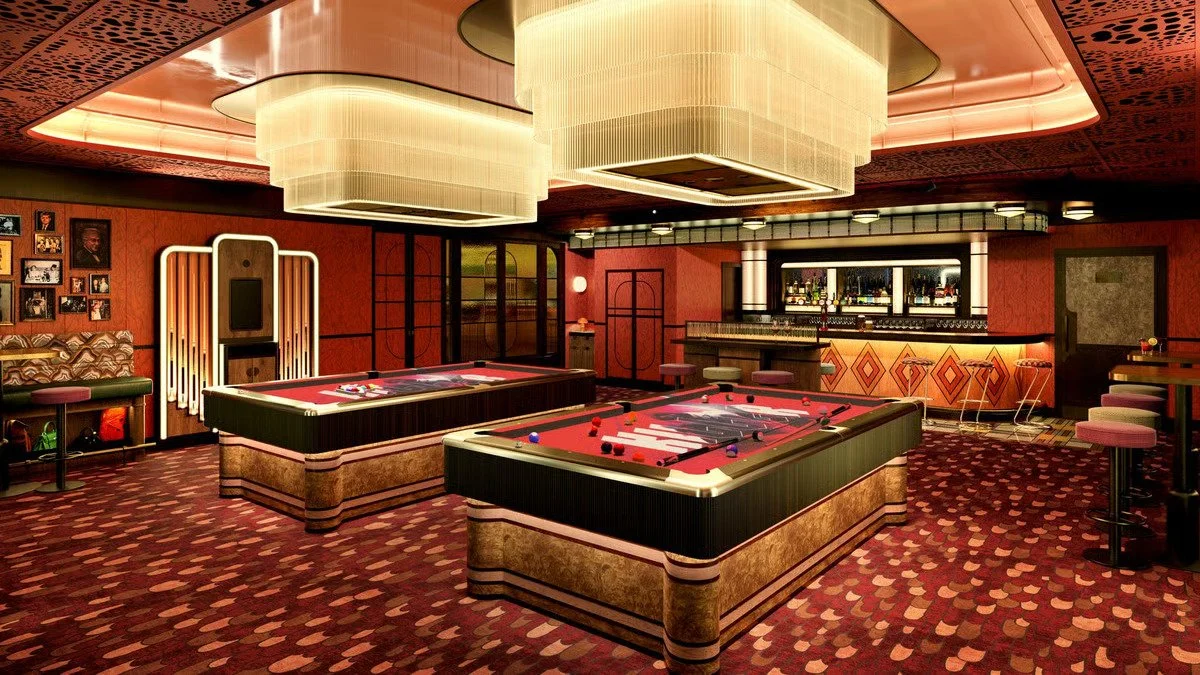 Every table is crowned with a custom three-tier chandelier, housing the venue’s cutting-edge game technology within sculptural lighting features.